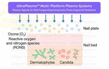 Onychomycosis (tinea unguium) is a prevalent fungal infection of the nail unit, often caused by dermatophytes, Candida species, and nondermatophytic molds. Traditional antifungal therapies suffer from long treatment durations, recurrence, and limited nail penetration. The UltraPlasma™ multi-platform plasma system—utilizing arc, argon, and helium plasma technologies—offers a novel, non-invasive treatment modality. This review details the mechanism of UltraPlasma™ in fungal nail infections, emphasizing its interaction with nail layers, pathogen types, and the biochemical activity of generated reactive gases such as ozone (O₃), nitric oxide (NO), and reactive oxygen/nitrogen species (RONS). Figures illustrate emission spectra, cross-sectional nail penetration, gas interactions, and clinical progress. The integration of photothermal, photochemical, and bioelectric effects renders this method an effective solution for resistant or recurrent onychomycosis.